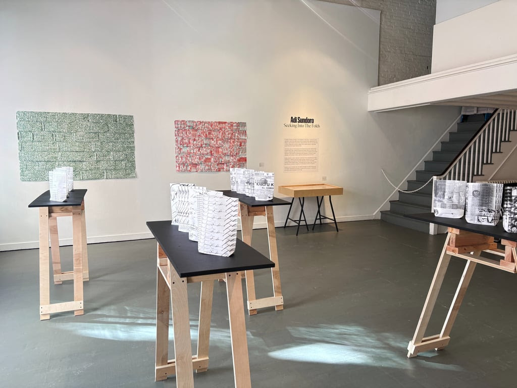 Dalam pameran bertajuk Seeking into The Folds, Adi Sundoro menghadirkan instalasi berbasis media kertas yang terinspirasi dari fenomena keseharian di Indonesia: penggunaan dokumen rahasia sebagai pembungkus gorengan oleh pedagang kaki lima.