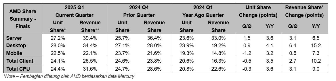 Secara keseluruhan, total pangsa pendapatan AMD meningkat 9,0 poin persentase Y/Y dan 3,0 poin persentase Q/Q, mencapai 31,6%. Hal ini menandai pencapaian penting bagi perusahaan dalam memperluas dominasinya di berbagai segmen pasar, dari server hingga perangkat klien.