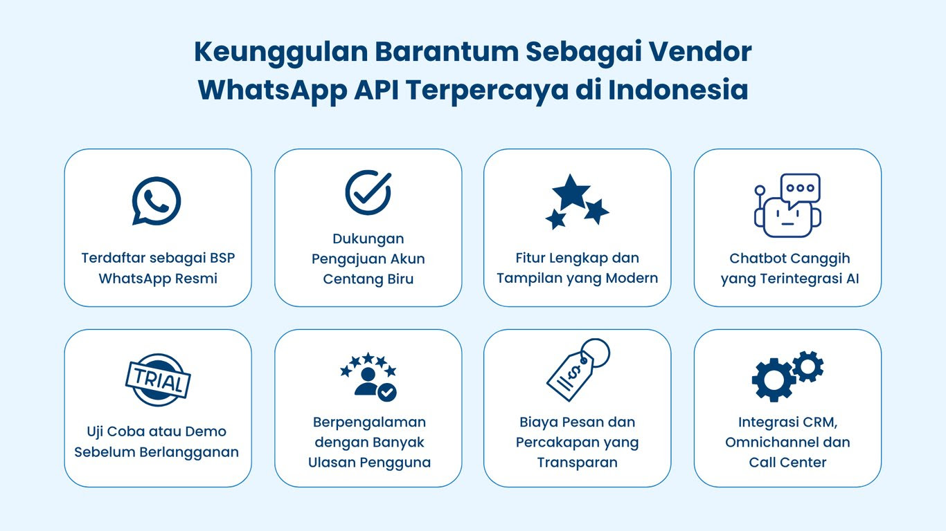 Barantum merupakan partner resmi WhatsApp di Indonesia. Ini memastikan setiap implementasi berjalan sesuai standar dan kebijakan Meta, bukan solusi abu-abu yang berisiko.