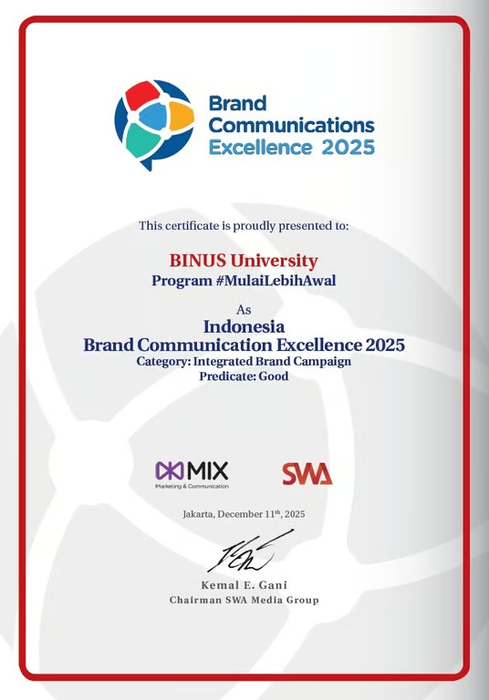 Pencapaian ini sekaligus menegaskan komitmen BINUS University untuk terus memberikan yang terbaik bagi masyarakat Indonesia melalui pendidikan yang relevan, berdampak, dan berorientasi masa depan. Dengan mengedepankan inovasi, kolaborasi, serta pemanfaatan teknologi secara strategis, BINUS University berupaya menghadirkan ekosistem pembelajaran yang tidak hanya mencetak lulusan siap berkarier, tetapi juga mampu berkontribusi aktif dalam pembangunan bangsa. Kampanye #MulaiLebihAwal menjadi representasi nyata bagaimana BINUS University menerjemahkan visi Fostering and Empowering the Society ke dalam komunikasi yang bermakna dan mudah dipahami oleh generasi muda Indonesia.