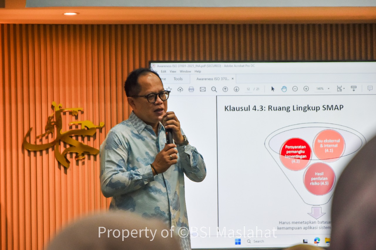 Sukoriyanto Saputro, Direktur Eksekutif BSI Maslahat, menegaskan bahwa komitmen terhadap penerapan SMAP bukanlah simbolik semata, melainkan menyeluruh hingga ke dalam nilai kelembagaan. “Penerapan Sistem Manajemen Anti-Penyuapan (SMAP) di BSI Maslahat tidak berhenti pada tataran teknis administratif, tetapi menjadi komitmen kolektif yang dimulai dari level tertinggi manajemen hingga seluruh lini karyawan. Kami percaya bahwa kepemimpinan dengan integritas adalah kunci keberhasilan penerapan SMAP secara menyeluruh. Oleh karena itu, seluruh jajaran pimpinan memiliki tanggung jawab moral dan strategis untuk menjadi teladan dalam membangun budaya anti-penyuapan di lingkungan kerja,” ujarnya.