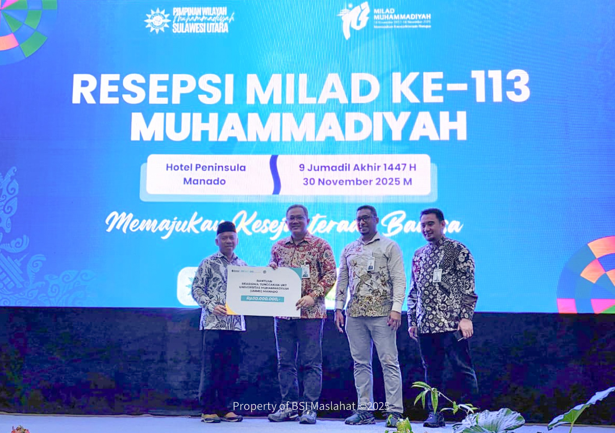 Penyerahan bantuan dilakukan secara simbolis oleh RCEO BSI Region 10 Makassar, Sukma Dwie Priadi, kepada Ketua PWM Sulawesi Utara, Masrur Mustamat. Penyerahan berlangsung pada perayaan Milad Muhammadiyah ke-113 di Hotel Sintesa Peninsula Manado, Minggu (30/11).