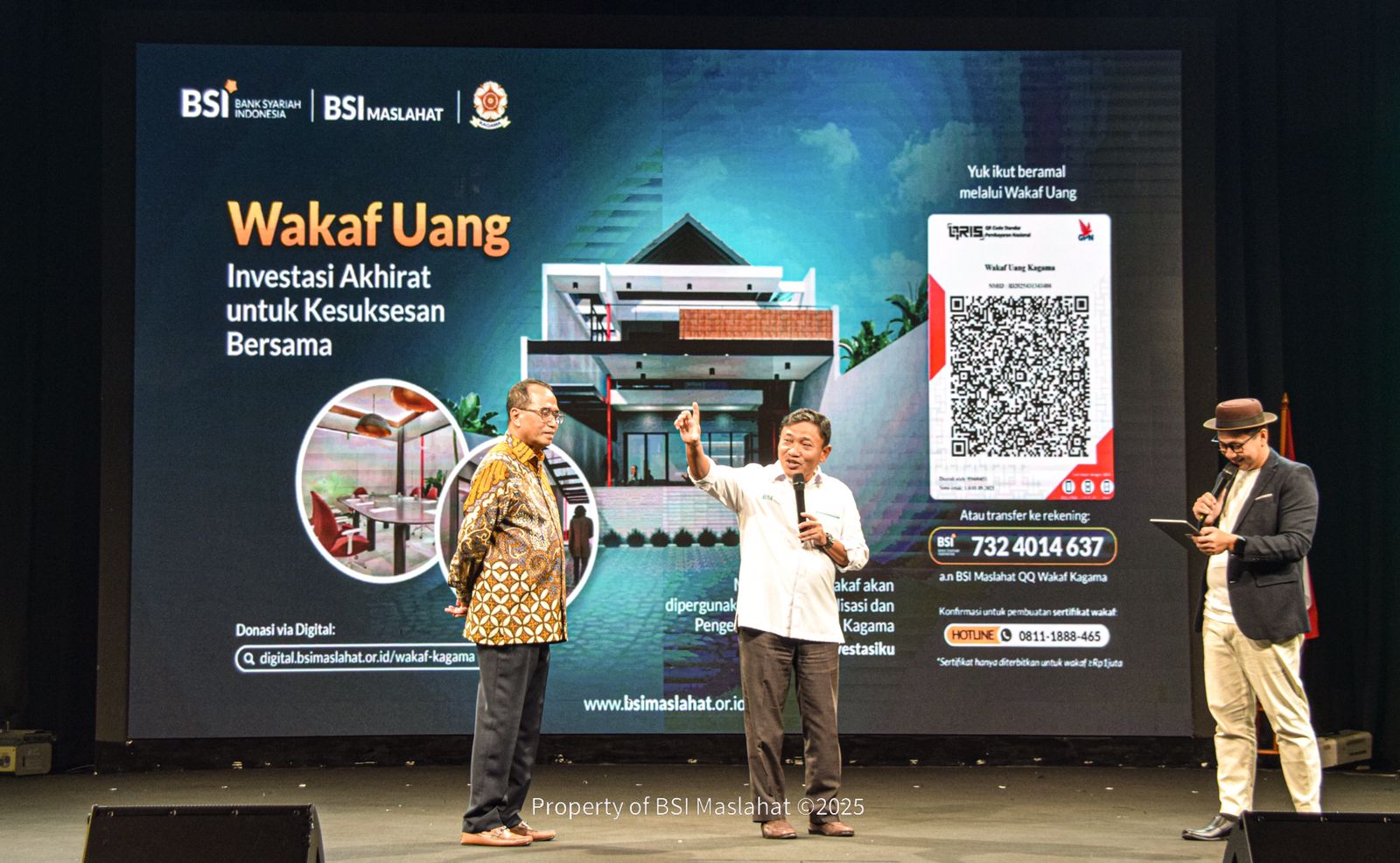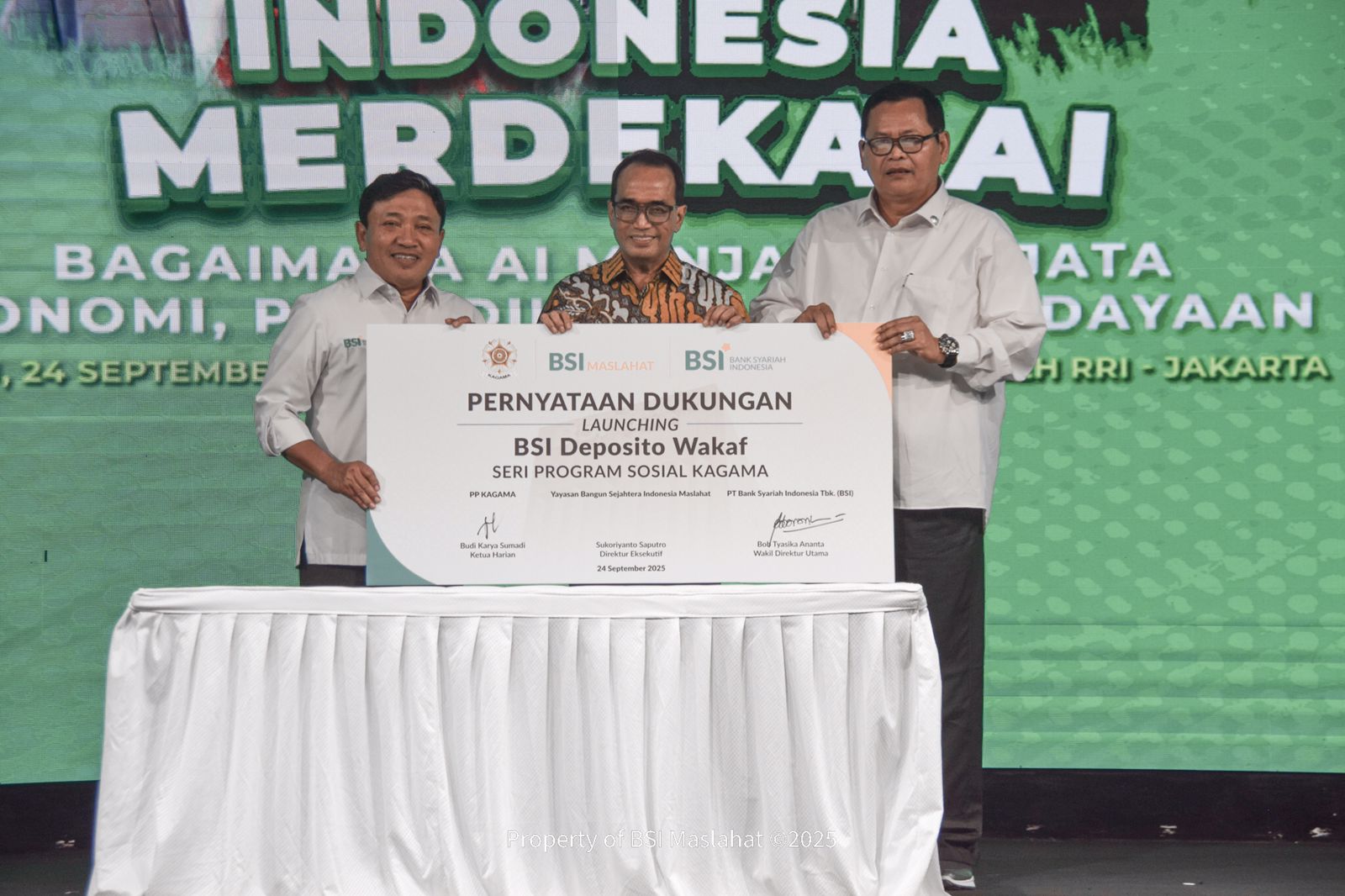 Jakarta, 29 September 2025 – BSI Maslahat mendukung Wakaf Seri KAGAMA (Keluarga  Besar Alumni Universitas Gadjah Mada) dalam kegiatan “Indonesia Merdeka AI:  Bagaimana AI Menjadi Senjata Ekonomi, Pendidikan, dan Kebudayaan”. Deposito  Wakaf Seri KAGAMA merupakan program Wakaf Uang Abadi dan Sementara, di mana  hasil wakaf akan disalurkan dalam bentuk bantuan renovasi Rumah Kagama. KAGAMA  memiliki potensi penghimpunan wakaf yang besar, mencapai lebih dari 375 ribu orang  ditambah dengan sivitas mahasiswa UGM. Program ini diselenggarakan pada tanggal  24 September 2025 di Gedung Abdulrahman Saleh RRI.