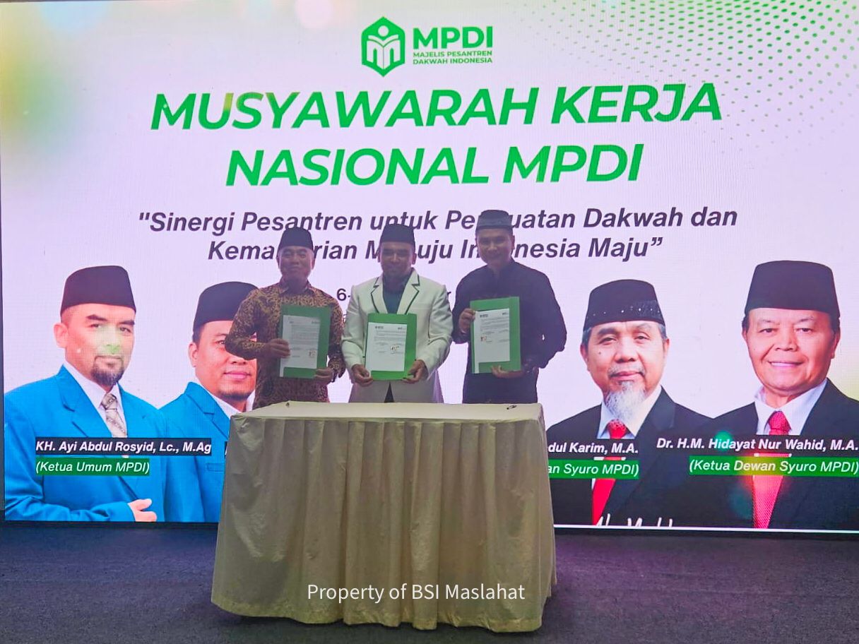 Penandatanganan MoU dilakukan oleh Direktur Sales & Distribution BSI Maslahat, Nasrudin, dan Ketua MPDI, KH. Ayi Abdul Rosyid. Melalui kerja sama ini, kedua lembaga berkomitmen untuk memperluas sinergi program pemberdayaan yang selaras dengan nilai-nilai dakwah, pendidikan, dan pembangunan masyarakat pesantren.