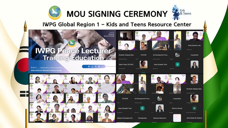 International Women’s Peace Group (IWPG) Global Region 1 (Direktur Regional: Na Hyeong Jeon), menandatangani Nota Kesepahaman daring dengan LSM Nigeria Kids and Teens Resources Center untuk bekerja sama dalam pendidikan perdamaian.