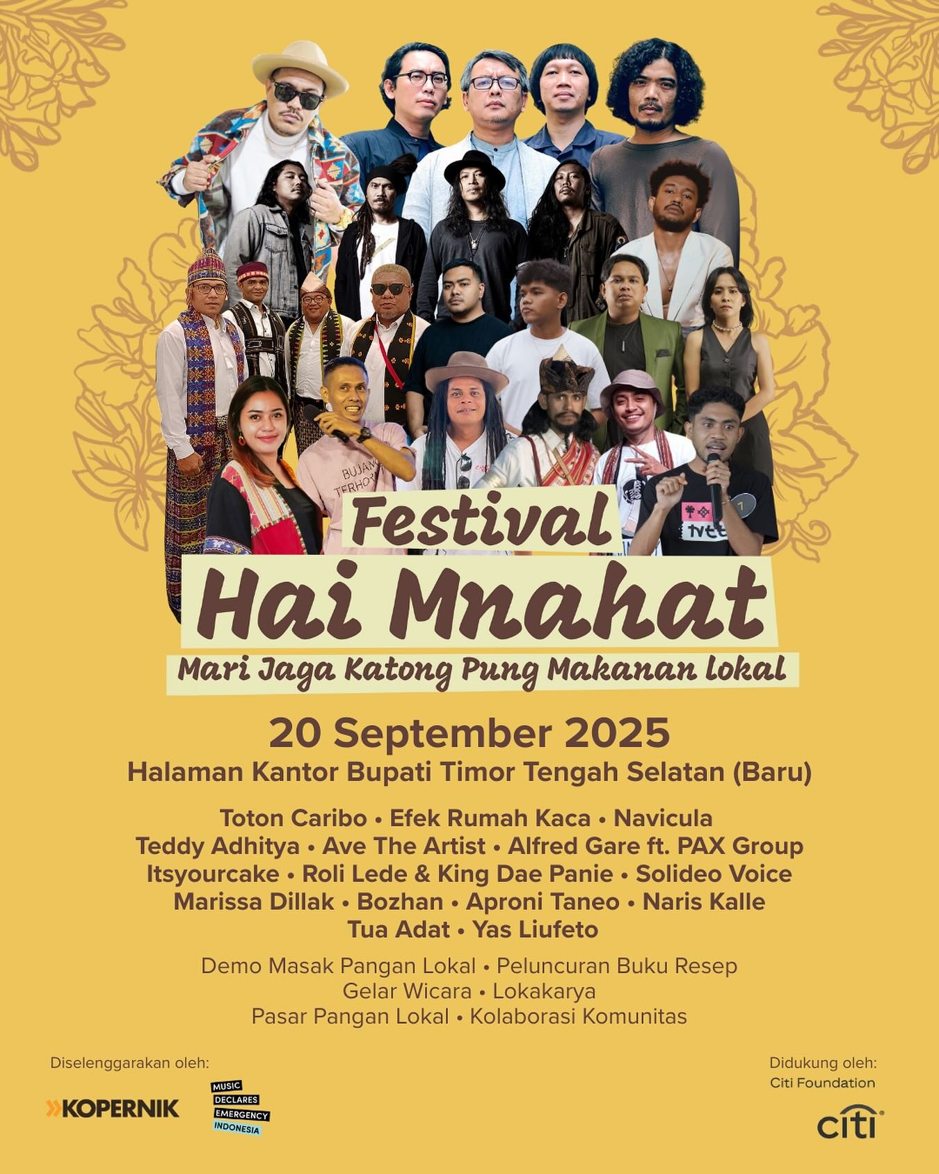 Festival ini menghadirkan rangkaian kegiatan sepanjang hari dengan fokus pada pangan lokal, seni, dan kolaborasi komunitas. Musisi, komika, dan aktivis pangan dari Timor, Flores, Bali, Malang, Jogja, hingga Jakarta dijadwalkan ikut serta.