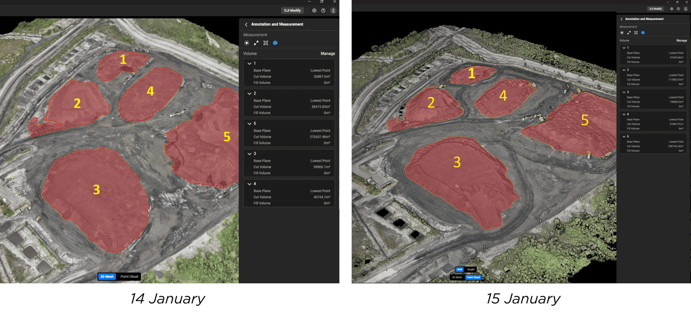 – Pemetaan Georeferensi: menampilkan lokasi stockpile dan perubahan volume secara jelas