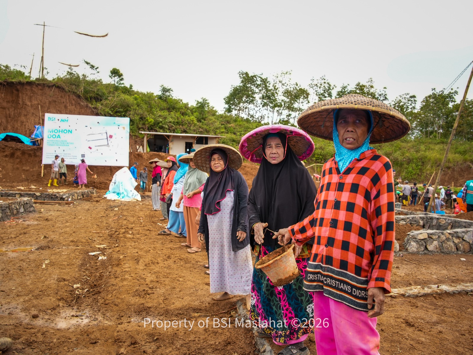Antusiasme warga atas dukungan yang diberikan BSI Maslahat sangat tinggi. Terlihat dari para ibu yang rela berpanas-panasan mengangkut pasir menggunakan ember kecil. Berpindah tangan secara estafet menuju lokasi pembangunan Recycle House. Di bawah terik matahari, para ibu memakai “caping”, topi terbuat dari anyaman bambu, biasa dipakai oleh para petani yang berfungsi melindungi kepala petani dari panas matahari dan hujan saat bekerja di sawah.