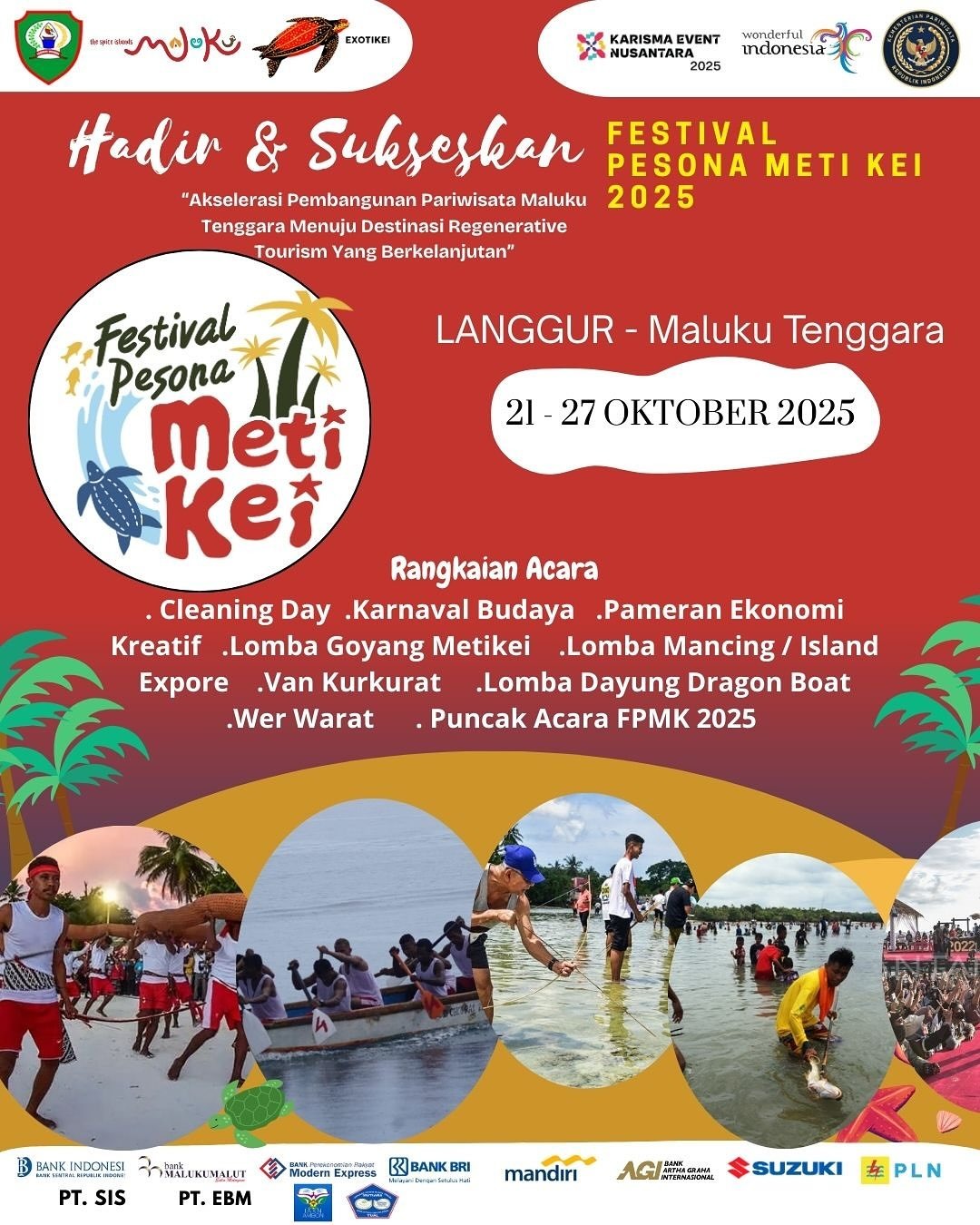 Langgur, 20 Oktober 2025 – Festival Pesona Meti Kei (FPMK) 2025 akan segera digelar di Kota Langgur, Kabupaten Maluku Tenggara. Acara tahunan ini dijadwalkan berlangsung selama tujuh hari, mulai 21 hingga 27 Oktober 2025.