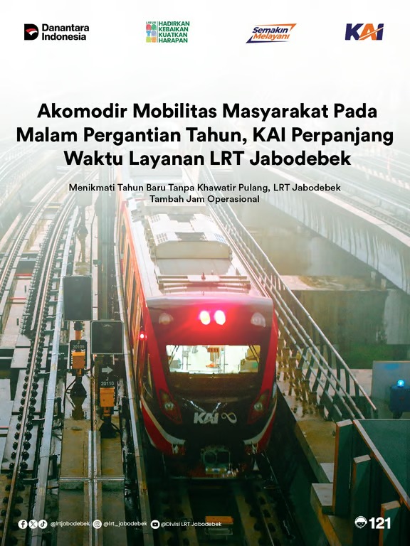 Bekasi, 30 Desember 2025 – Sebagai upaya mendukung kelancaran mobilitas masyarakat pada malam tahun baru, KAI memperpanjang waktu layanan LRT Jabodebek khusus pada 31 Desember 2025 hingga 1 Januari 2026. Pada periode tersebut, layanan LRT Jabodebek akan beroperasi hingga pukul 01.44 WIB dini hari.