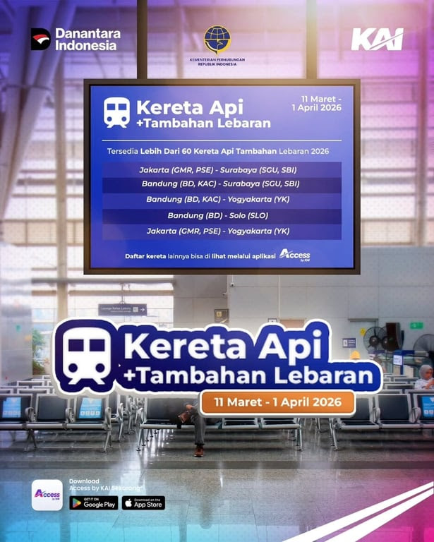 Penjualan tiket kereta api tambahan Lebaran tersebut dapat dilakukan mulai 11 Februari 2026 pukul 00.00 WIB melalui seluruh kanal penjualan resmi KAI, seperti aplikasi Access by KAI, website booking.kai.id, serta mitra penjualan resmi lainnya.