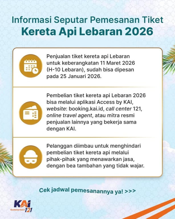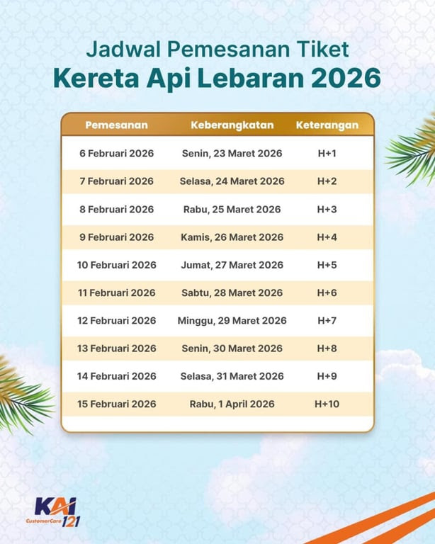 Masa Liburan Lebaran 2026 kian mendekat. Melalui skema pemesanan H-45, PT Kereta Api Indonesia (Persero) membuka penjualan tiket kereta api secara bertahap, sehingga masyarakat yang melakukan pemesanan pada 25 Januari 2026 sudah dapat merencanakan perjalanan untuk keberangkatan mulai 11 Maret 2026.