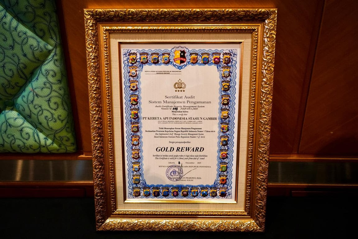 16 Desember 2025 – Stasiun Gambir, sebagai salah satu Objek Vital Nasional milik PT Kereta Api Indonesia (Persero), berhasil meraih Sertifikat Penerapan Sistem Manajemen Pengamanan (SMP) Objek Vital Nasional dan Objek Tertentu Tahun 2025 dari Badan Pemelihara Keamanan (Baharkam) Polri. Sertifikat tersebut diserahkan pada Senin (15/12) sebagai bentuk apresiasi atas keberhasilan Stasiun Gambir dalam menerapkan sistem pengamanan sesuai standar nasional. Pencapaian tersebut diraih setelah melalui proses audit menyeluruh terhadap penerapan Sistem Manajemen Pengamanan. Berdasarkan hasil audit, Stasiun Gambir memperoleh nilai 89,48 persen dengan kategori GOLD, yang merupakan kategori tertinggi dalam penilaian penerapan Sistem Manajemen Pengamanan pada Objek Vital Nasional.