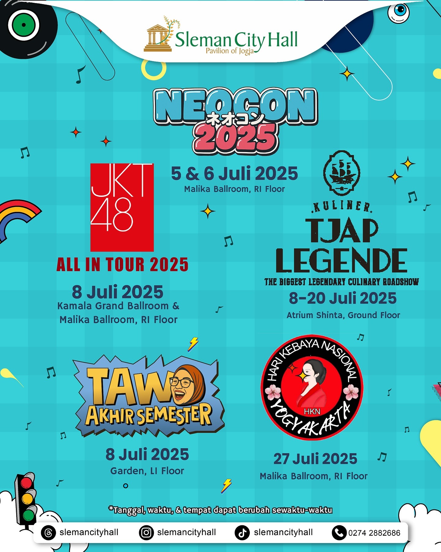 Untuk informasi lebih lanjut, masyarakat dapat mengunjungi akun media sosial resmi penyelenggara di Instagram, TikTok, dan Facebook dengan nama pengguna @slemancityhall. Perubahan waktu, tempat, dan agenda acara dapat terjadi sewaktu-waktu sesuai kebijakan penyelenggara.