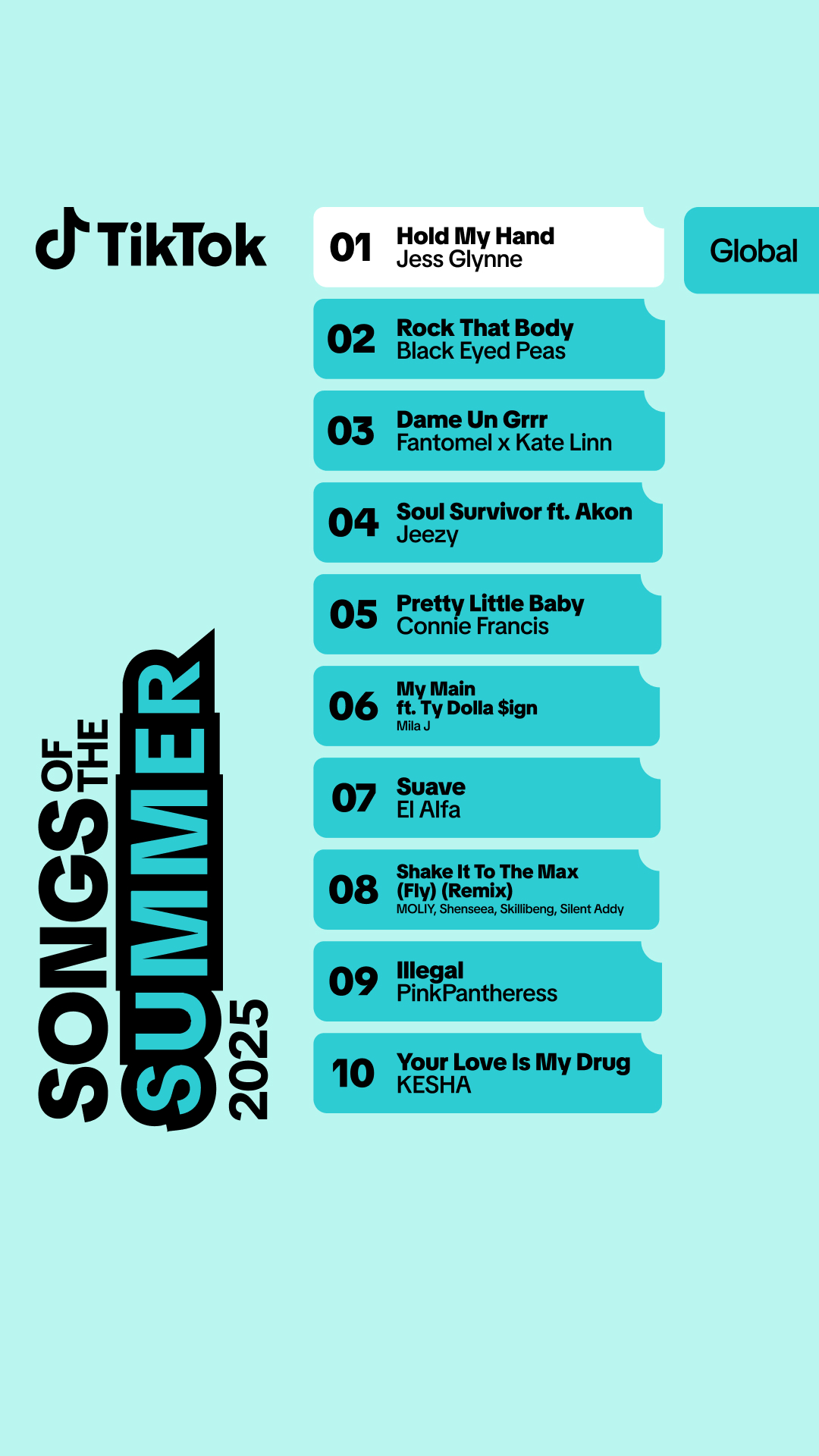 Daftar Global 10 Songs of the Summer 2025 di TikTok mencerminkan ragam selera musik  komunitas TikTok lintas genre, era, dan musisi—baik musisi yang sudah mapan maupun  pendatang baru.