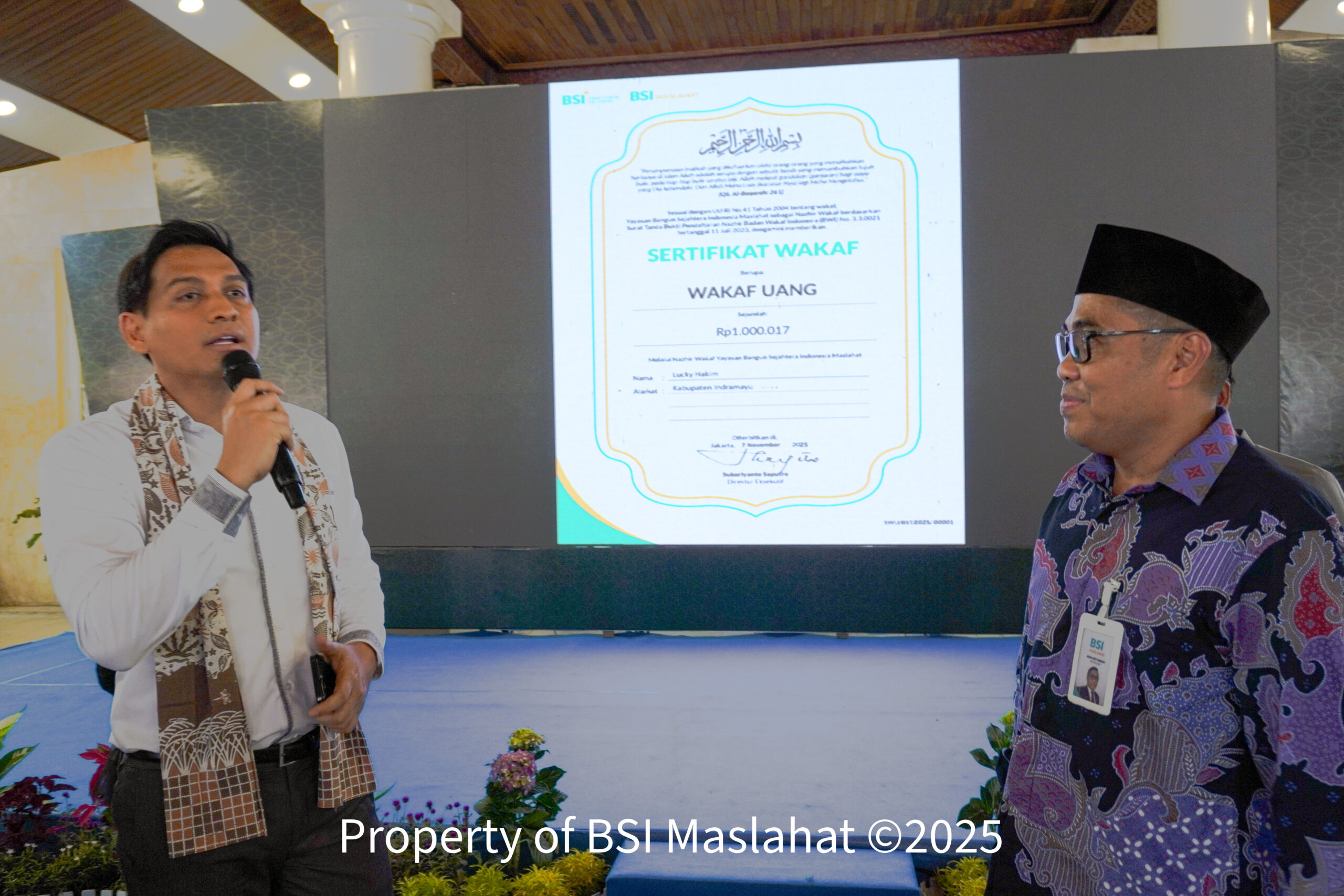 Indramayu, 10 November 2025 – BSI Maslahat bersama Kementerian Agama (Kemenag) Kabupaten Indramayu meresmikan Program Kota Wakaf pada Jumat, (7/11) di Pendopo Raden Bagus Arya Wiralodra. Kegiatan ini dihadiri oleh Direktur Jenderal Bimbingan Masyarakat Islam Kementerian Agama, Prof. Dr. H. Abu Rokhmad, M.Ag; Direktur Pemberdayaan Zakat dan Wakaf, Prof. Dr. H. Waryono Abdul Ghafur, M.Ag; Bupati Indramayu, Lucky Hakim; dan Kepala Kantor Wilayah Kemenag Provinsi Jawa Barat, H. Dudu Rohman, M.Si..