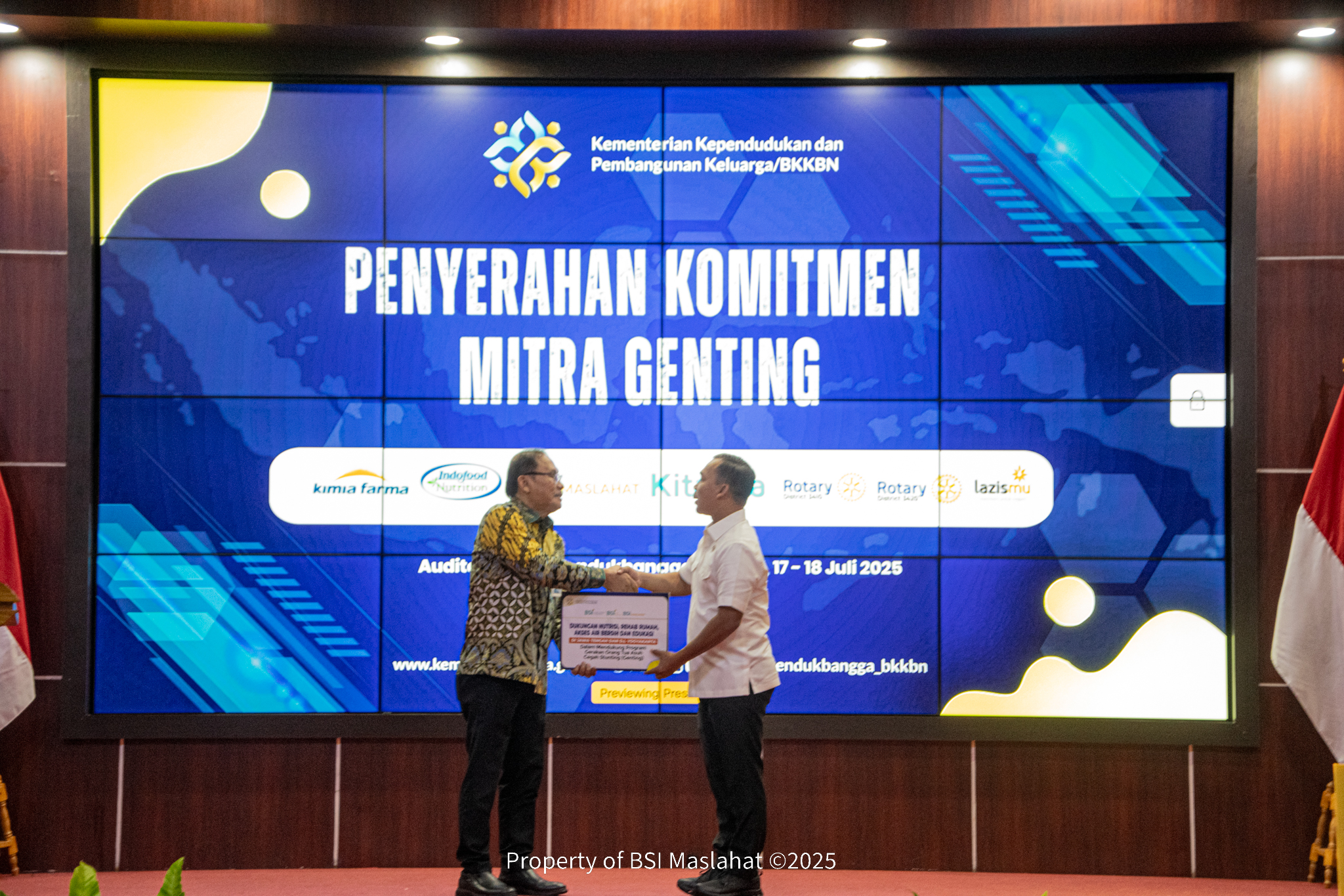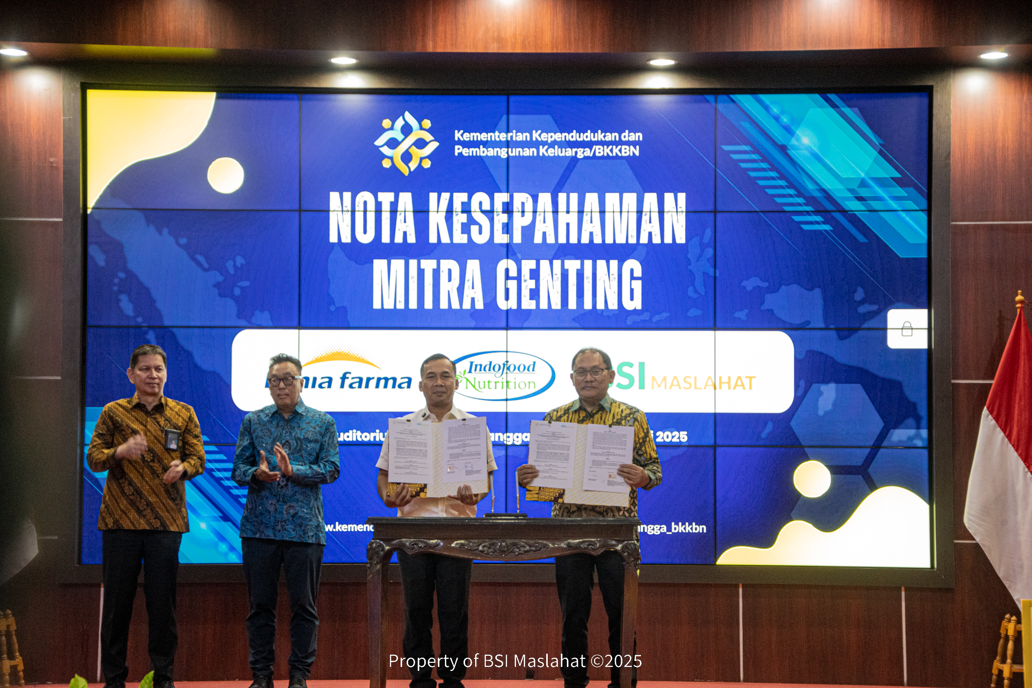 Jakarta, 17 Juli 2025 – Dalam rangka mencegah dan menurunkan angka stunting di Indonesia, serta memperkuat kolaborasi kelembagaan, BSI Maslahat bersama BKKBN lakukan penandatanganan perjanjian kerja sama (MoU) Program Gerakan Orang Tua Asuh Cegah Stunting (GENTING). Penandatanagan MoU dilakukan oleh Menteri Kependudukan dan Pembangunan Keluarga Berencana Nasional (BKKBN), Dr. Wihaji, S.Ag., M.Pd. dan Direktur Eksekutif BSI Maslahat, Sukoriyanto Saputro, di Gedung Auditorium BKKBN.