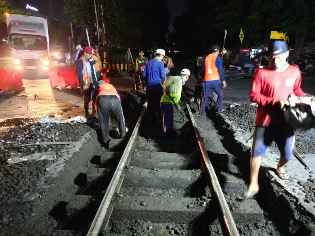 Buka–tutup jalan diberlakukan untuk proses Pekerjaan pembongkaran aspal perlintasan, penggantian bantalan beton, serta pengangkatan listring.