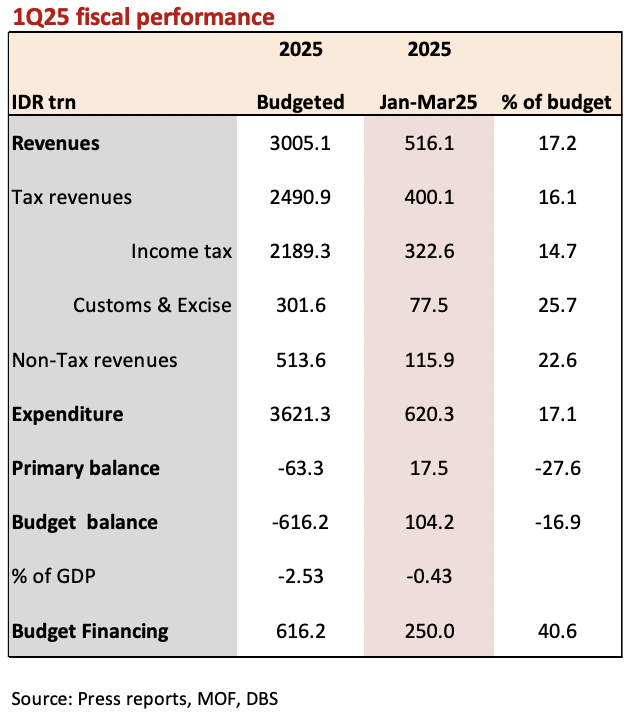 Anggaran Indonesia tetap mengalami defisit pada triwulan pertama tahun 2025 sebesar -0,4% dari PDB, tergelincir ke zona merah lebih awal dari tahun-tahun sebelumnya, seperti pada Mei tahun lalu dan Oktober pada 2023. Pendapatan kumulatif Januari hingga Maret 2025 dilaporkan turun 13,6% secara tahunan (laporan), membaik dari penurunan 21% di Januari hingga Februari, tetapi masih menandakan dorongan yang lemah. Hal ini dibandingkan dengan rata-rata kenaikan pendapatan sebesar 30% pada kuartal pertama dalam dua tahun terakhir.