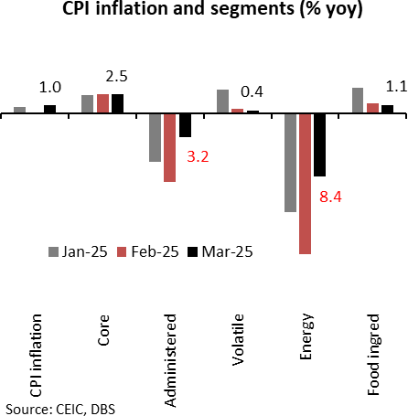 Perkembangan inflasi cukup kondusif, sama seperti indikator pertumbuhan yang melambat (akan dibahas pada bagian selanjutnya), yang membuka peluang untuk pelonggaran kebijakan. Para pembuat kebijakan kemungkinan akan mengawasi pasar keuangan, dengan pelemahan lebih lanjut pada rupiah (berkinerja terburuk di kawasan ini sebesar -3,9% YTD vs USD) dan obligasi, karena ketidakpastian global dan ketidakjelasan yang berkepanjangan mengenai perkembangan fiskal dalam negeri yang dapat mendorong pasar untuk memperkirakan penurunan suku bunga pada kuartal ini. DBS Group Research memperkirakan para pembuat kebijakan masih akan memanfaatkan peluang yang ada, ketika isu tarif mengendap, untuk menurunkan suku bunga sebesar 50bps di tahun ini, karena suku bunga riil menandakan adanya penyangga yang signifikan.