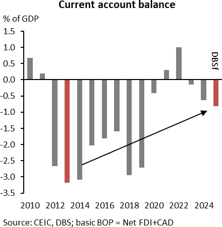 Indonesia mencatat defisit transaksi berjalan yang moderat sebesar -0,6% dari PDB pada tahun 2024. Dengan asumsi penurunan surplus perdagangan barang sebesar 20% tahun ini dan defisit pada kategori barang tak terlihat, DBS Group Research memperkirakan defisit neraca transaksi berjalan tahun 2025 mencapai -0,8% dari PDB. Di sisi pembiayaan, arus FDI neto diperkirakan akan tetap kuat tetapi melambat mulai tahun 2024, dikombinasikan dengan arus masuk portofolio yang moderat dan defisit moderat di pos-pos lainnya. Secara kumulatif, hal ini akan menyebabkan surplus BOP secara keseluruhan mencapai seperlima dari rata-rata enam tahun terakhir.