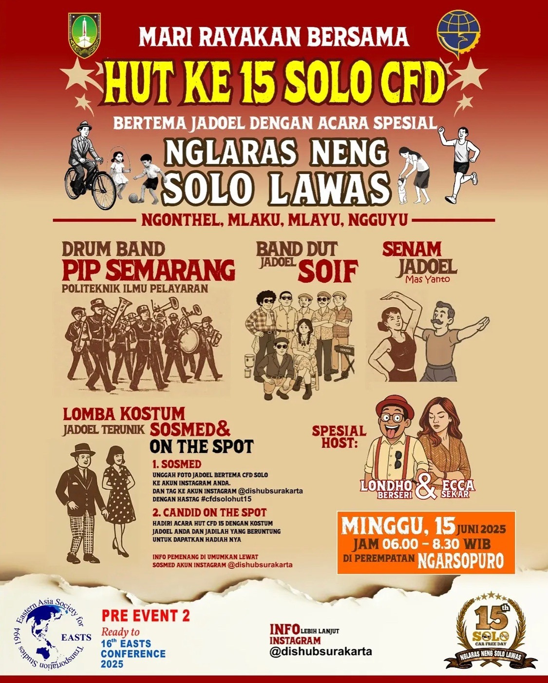 Solo, 11 Juni 2025 – Perayaan ulang tahun ke-15 Car Free Day (CFD) Solo akan digelar pada akhir pekan ini, tepatnya pada Minggu, 15 Juni 2025. Meskipun hari jadi CFD Solo sebenarnya jatuh pada 30 Mei 2025, namun perayaannya diadakan dua pekan setelahnya demi memastikan kenyamanan peserta dan mendukung partisipasi masyarakat secara maksimal.