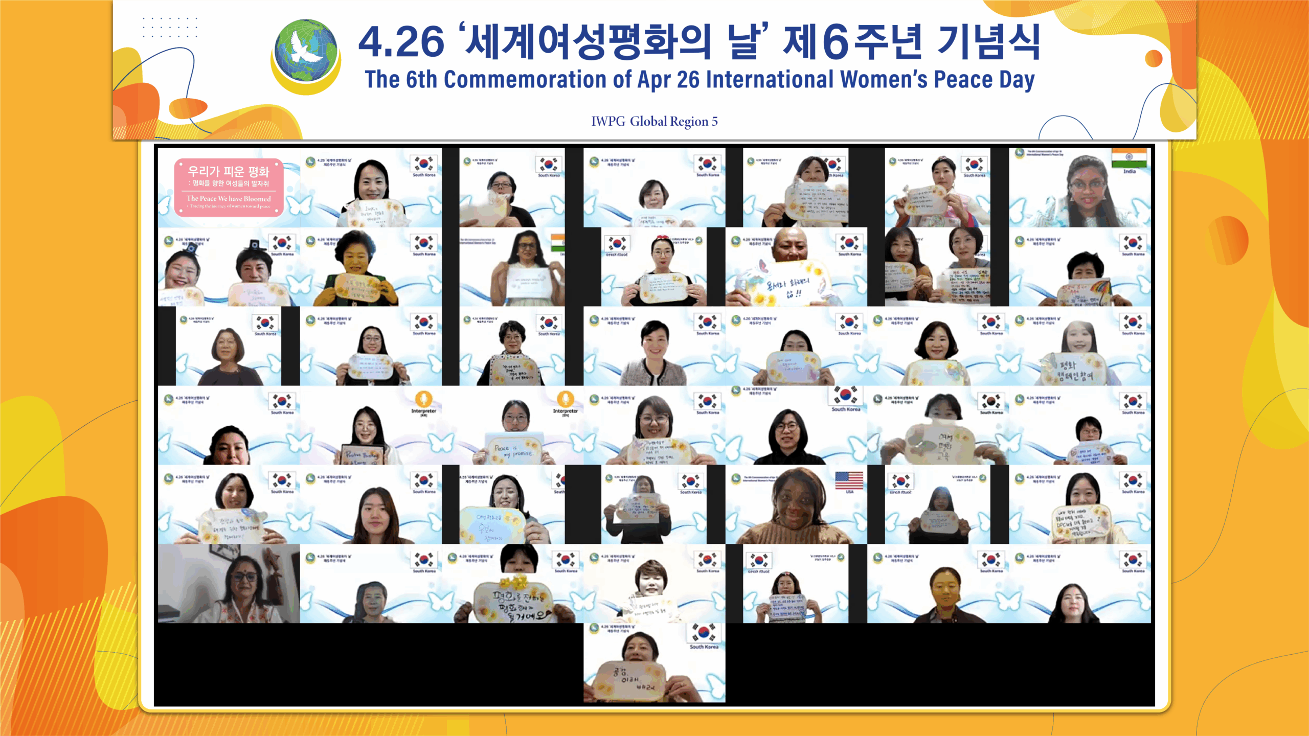 Di Goyang, Cabang Goyang, Seodaemun, Paju, dan Eunpyeong mengadakan acara bersama di Taman Imjingak Pyeonghwa Nuri. Acara peringatan diadakan di Peace Culture Bunker di Dobong-gu, Seoul, dan kampanye perdamaian di Sungai Yangjaecheon, Gangnam-gu. Di Filipina, delegasi perdamaian yang berkunjung dari Korea pada tanggal 22 hingga 27 April mengadakan upacara di depan Monumen Perdamaian IWPG ke-3 bersama anggota IWPG dan membahas kegiatan perdamaian dengan berbagai pemimpin di sana.