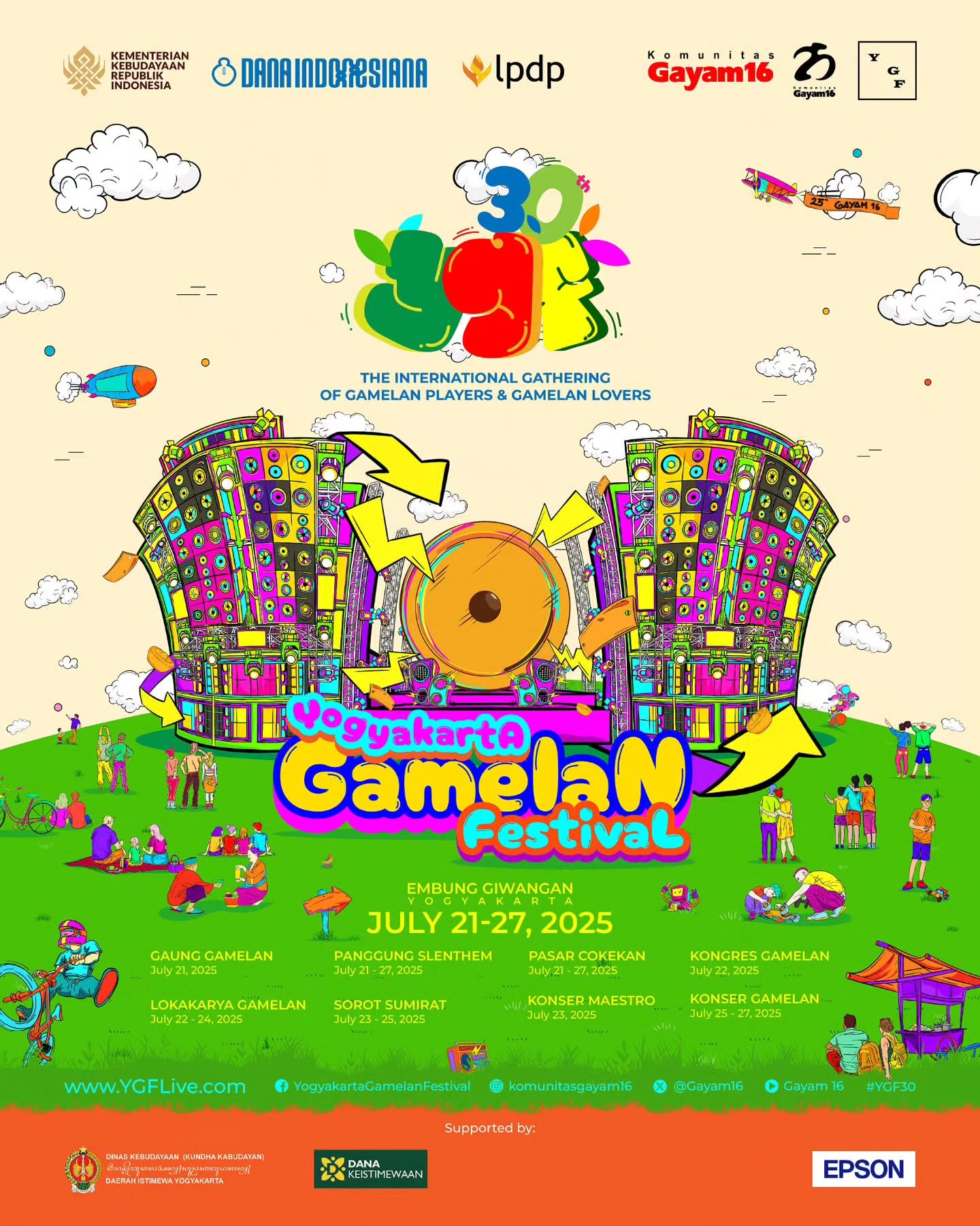 Yogyakarta, 2 Juli 2025 – Yogyakarta Gamelan Festival (YGF) akan kembali hadir pada tahun ini, menandai edisi ke-30 sejak pertama kali diselenggarakan. Berdasarkan pengumuman dari akun media sosial penyelenggara, festival ini akan berlangsung selama tujuh hari penuh, dari tanggal 21 hingga 27 Juli 2025, bertempat di Taman Budaya Embung Giwangan, Yogyakarta.